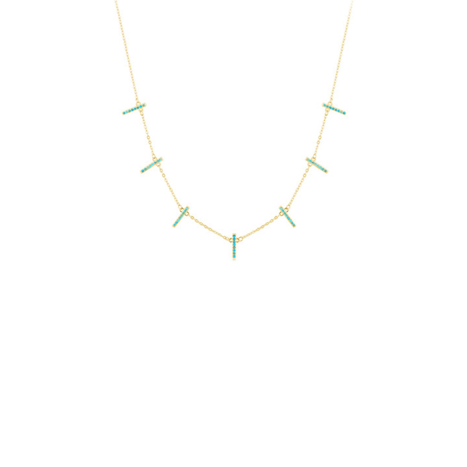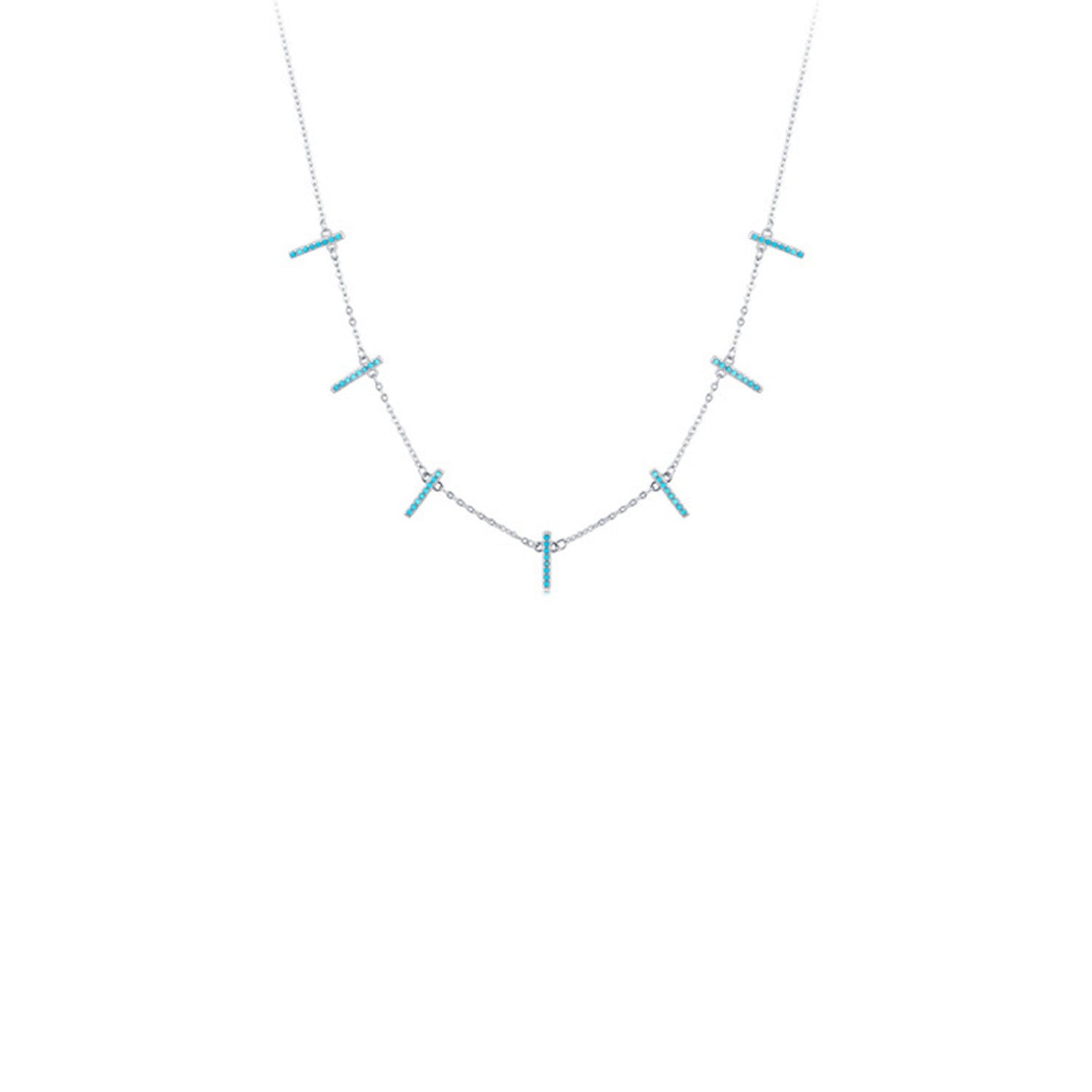The Turquoise Row ✦ Horizon Bar Necklace offers a balanced rhythm of vertical turquoise-set bars, delicately spaced along a fine silver chain. Like quiet markers across a serene skyline, each bar brings a pop of colour and clarity.